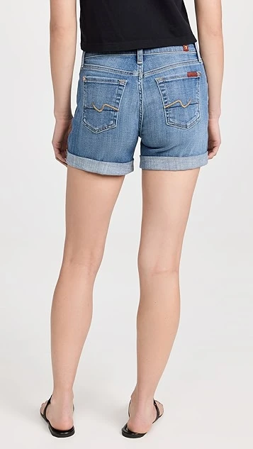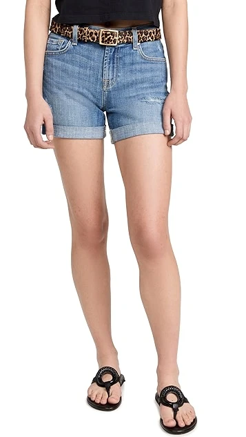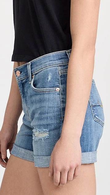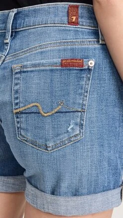 A classic pair of 7 For All Mankind jean shorts, featuring fixed cuffs, heavy fading, and shredded holes for an authentically broken-in look.