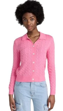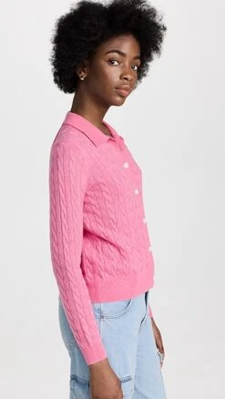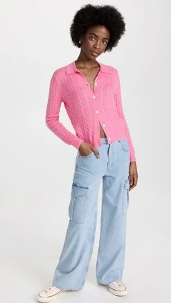 Slender cable patterning brings a timeless look to this Alex Mill collared cardigan sweater. Complement the light pink hue of this piece with a favorite pair of light wash jeans.