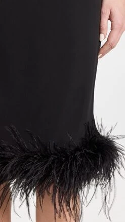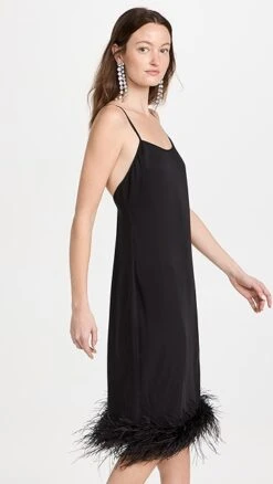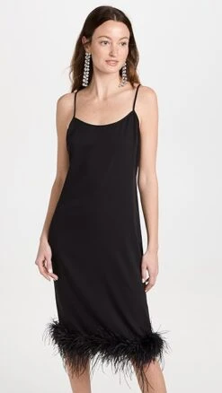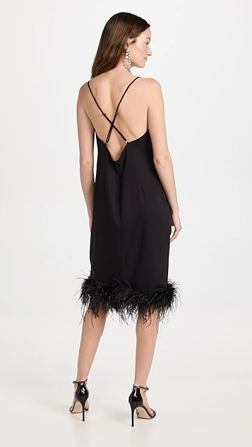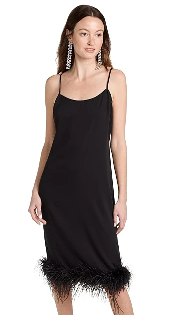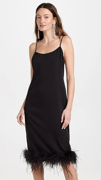 Amanda Uprichard’s Marianna dress is a classic slip with an of-the-moment twist, which comes courtesy of an arrangement of tonal feathers at the hem. Black heels and crystalline earrings will suit this piece particularly nicely.