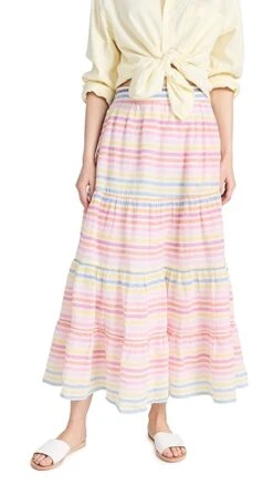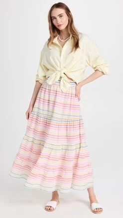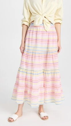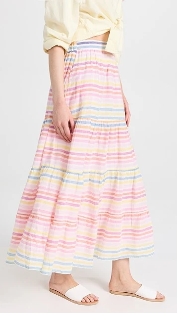 A multitude of pastel stripes detail this swingy and voluminous Banjanan skirt, a spring-ready piece in pure, lightweight cotton.