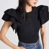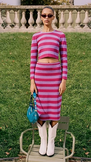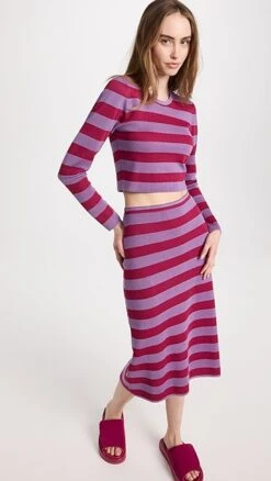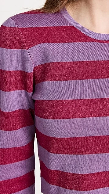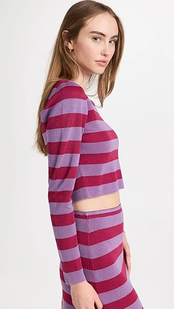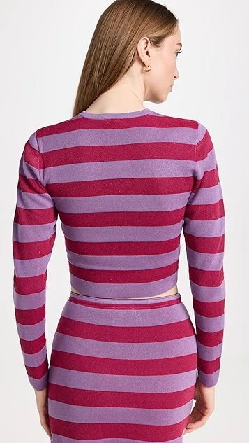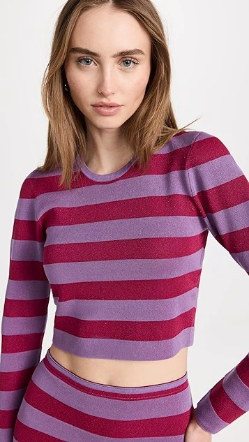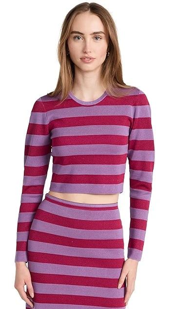 Bold color is the story with BAUM UND PFERDGARTEN’s Chaney top, a cropped pullover that combines red and purple tones in a classic stripe motif.