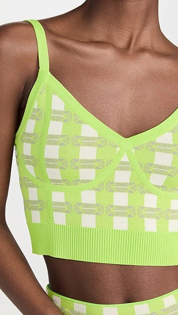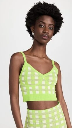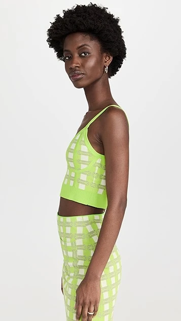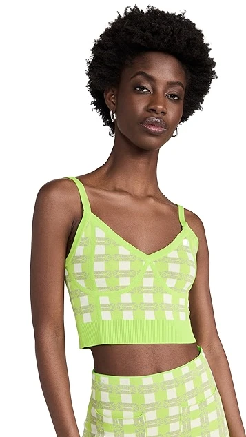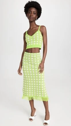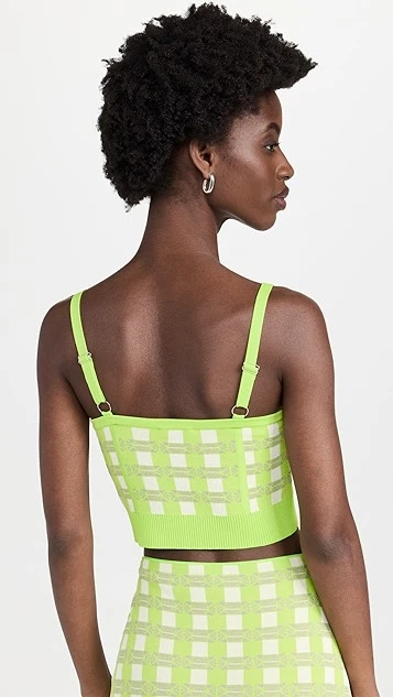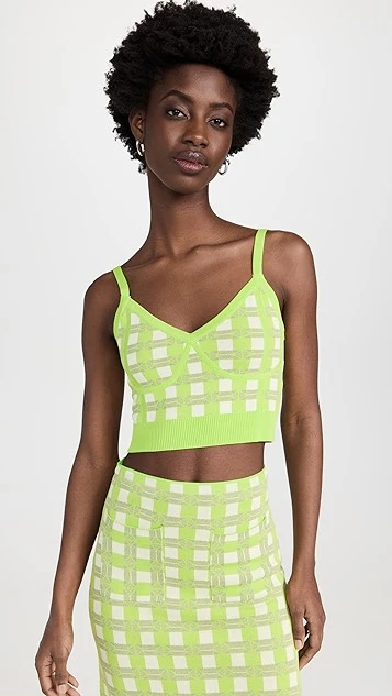 Plaid patterning in a bright color scheme draws attention to this BAUM UND PFERDGARTEN crop top, which is especially striking when paired with white sneakers and the brand’s matching skirt.