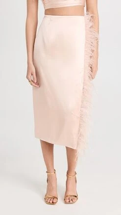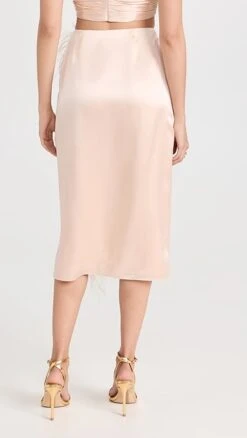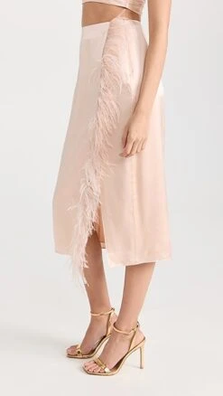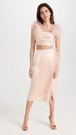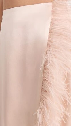 - Ostrich feather trim and knee-high slit