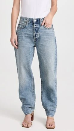 With an at-the-waist fit and a wide leg that’s sharply tapered, these heavily faded Citizens of Humanity jeans cut a unique silhouette. Give them time to shine by going with a white tee.