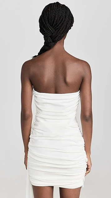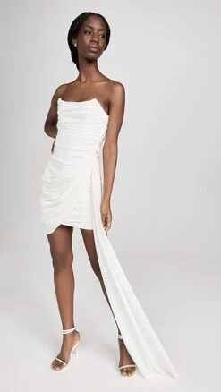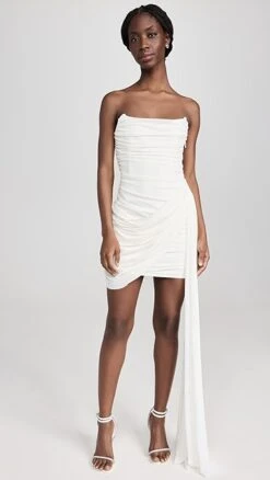 An occasion-ready Elliatt off shoulder mini dress with a unique look, which comes courtesy of a voluminously ruched silhouette and a floor-skimming sash that drapes from the waist.