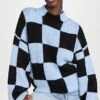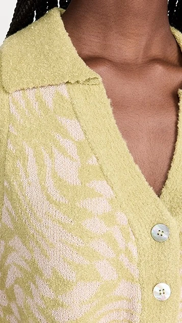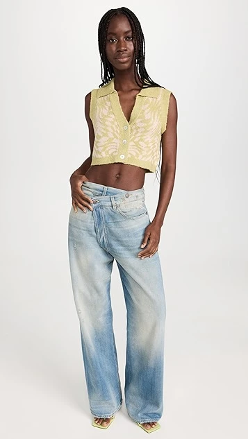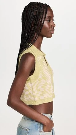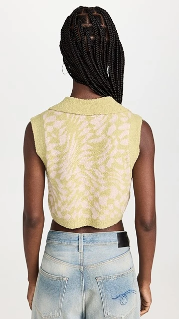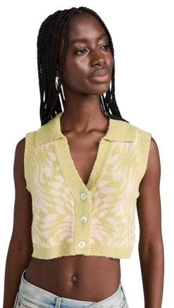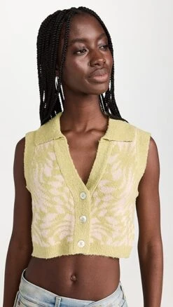 A cropped sweater vest from For Love & Lemons, featuring an abstract intarsia pattern and a vintage-inspired color scheme.
