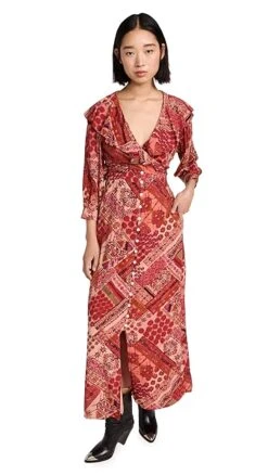 An instantly memorable Free People dress, detailed with intricate patterning and embellished with voluminous ruffles. Ties accentuate the waist, and the deep-V neckline provides a nice opportunity to give a new necklace the spotlight.