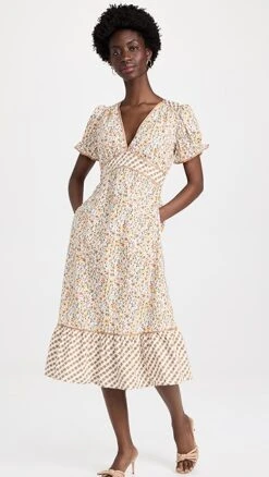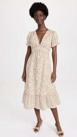 Contrast-pattern trim defines the empire waist and hem of this lovely Lost + Wander floral midi dress. To complete your outfit, add heeled sandals and hoop earrings.