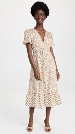 Contrast-pattern trim defines the empire waist and hem of this lovely Lost + Wander floral midi dress. To complete your outfit, add heeled sandals and hoop earrings.
