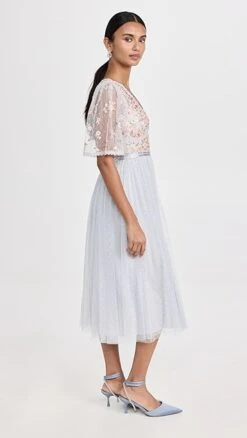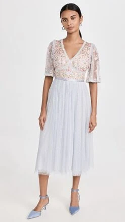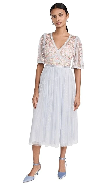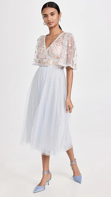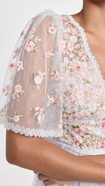 A captivating future favorite for special occasions, this Needle & Thread dress features a classic empire silhouette, a flocked tulle skirt, and elaborate lace patterning at the bodice.