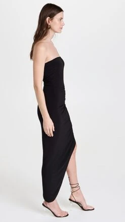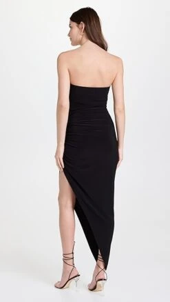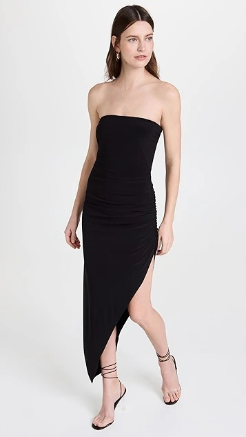 Angular asymmetry distinguishes the sleek silhouette of this Norma Kamali strapless dress, which is crafted from the label’s signature slinky black fabric.