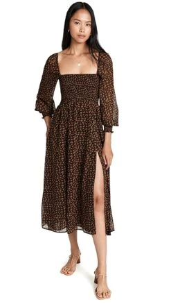 A picture-perfect version of an everyday maxi dress, this silhouette from OPT features soft smocking at the bodice, a classic floral print, and a deep front slit.