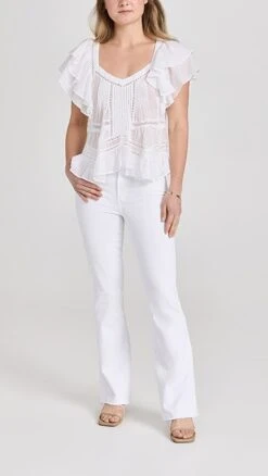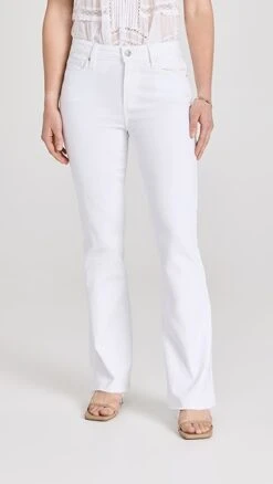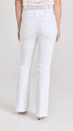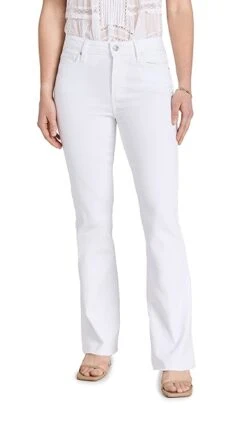 A polished and bright-white pair of PAIGE jeans with a classic boot cut silhouette and plenty of comfortable stretch. Raw cuffs provide a subtle undone finish.
