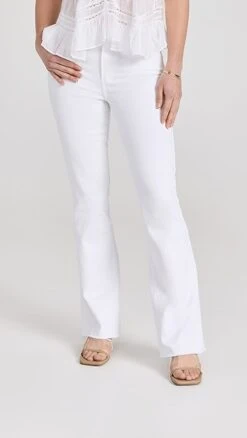 A polished and bright-white pair of PAIGE jeans with a classic boot cut silhouette and plenty of comfortable stretch. Raw cuffs provide a subtle undone finish.