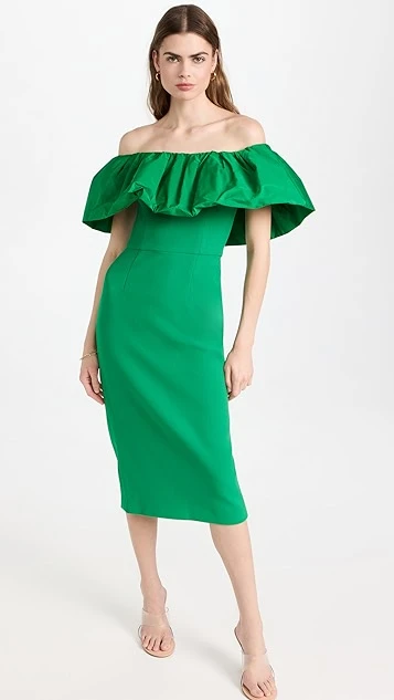 - Off-shoulder neckline with fold-over taffeta ruffle trim