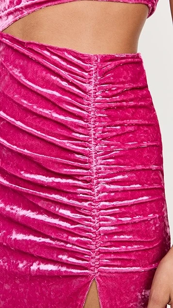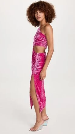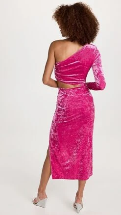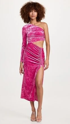 Shimmery, brightly colored velvet composes this occasion-worthy Saylor dress. A waist cutout and one-shoulder neckline add a touch of asymmetry, and a deep slit finishes the silhouette.