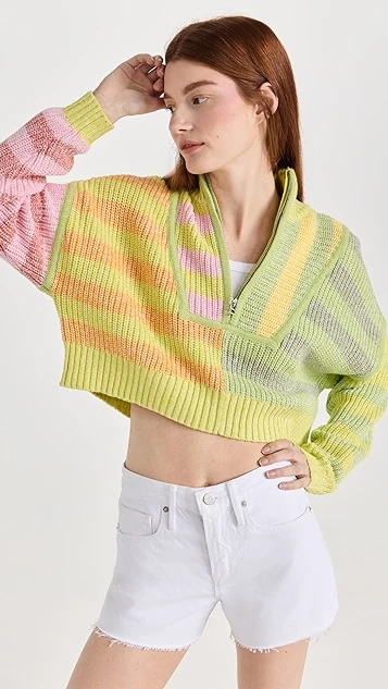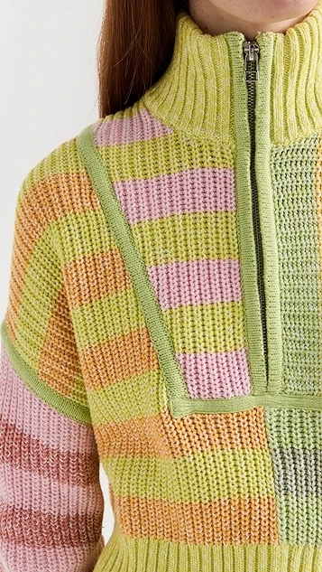 A charming piece of knitwear for transitional weather. This STAUD sweater cuts a unique silhouette, thanks to a slouchy drape, a half zip neckline, and an asymmetrical mix of light-colored stripes. Shorts and jeans will both work equally well with this piece.