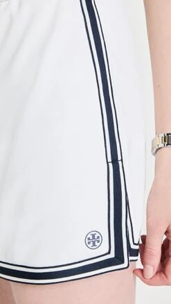 Sporty stripes and a logo emblem add a signature look to this workout-ready Tory Burch tennis skirt.