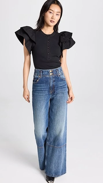 An everyday-friendly basic gets a romantic and eye-catching makeover. This Ulla Johnson Bonnie top features a ribbed-jersey body and henley-style neckline, as well as structured ruffles in tonal poplin at the shoulders. Tuck this piece into high-rise jeans to complete your outfit.