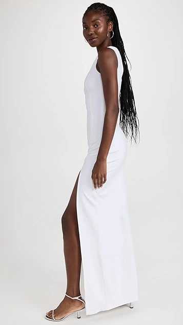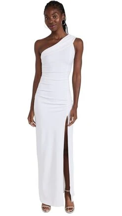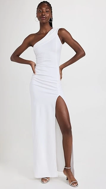 - Asymmetrical ruched side seams and thigh-high skirt slit