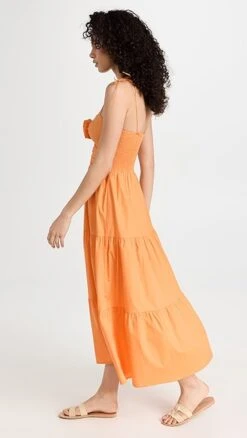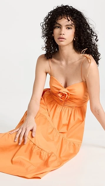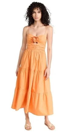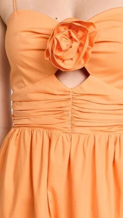 Spend your next warm-weather special occasion in this crisp WAYF dress, which is imbued with a striking shade of orange. A fabric rose, a small cutout, and elaborate ruching at the bodice add to the unique feel of this piece.