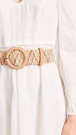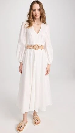 Drift through your day in this pure-linen Zimmermann white dress, which is outfitted with a buckle belt with multicolor beading for a unique finishing touch.